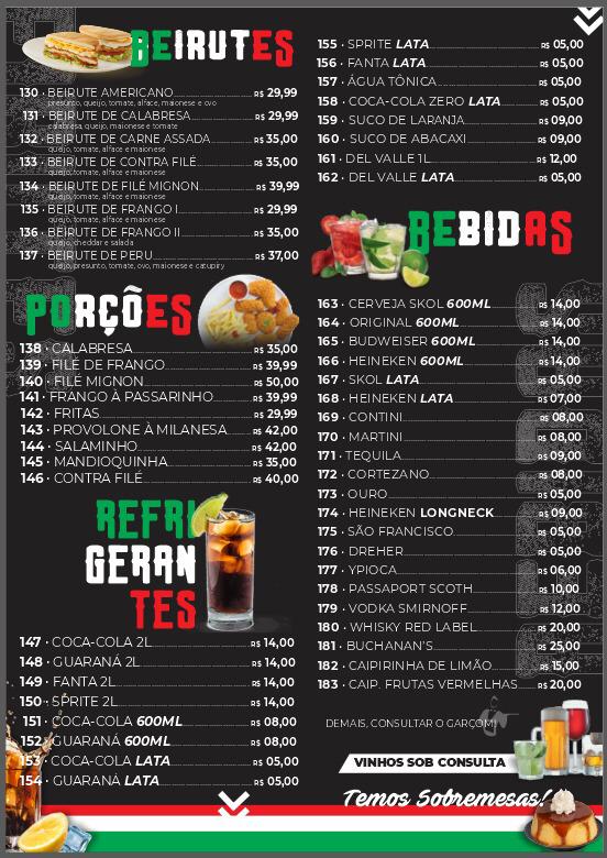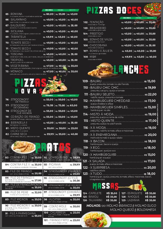 Among the standout items is the Pizza Calabresa, a delicious classic featuring spicy calabresa sausage. This pizza is perfect for those who enjoy bold and savory flavors, and at a reasonable price of R$ 52,00, it is a must-try. Another favorite is the Pizza Marguerita, a timeless choice that combines fresh mozzarella, basil, and a rich tomato sauce, priced at R$ 49,00. It's a simple yet satisfying option for anyone craving the authentic taste of Italy.